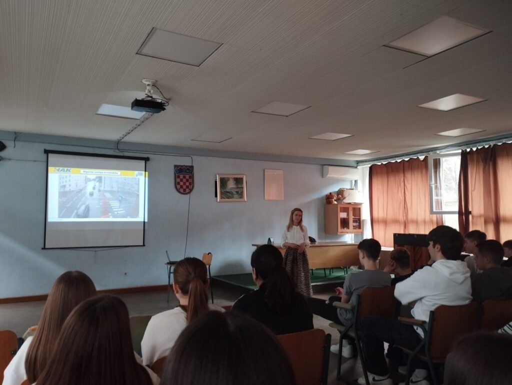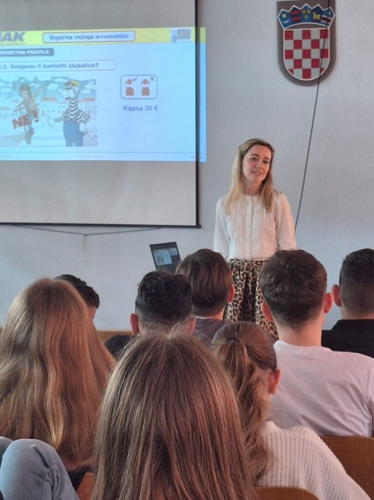 Kroz program HAKa Sigurna vožnja e- romobila, predavači Petra i Duje održali su predavanje o sigurnoj vožnji na e- romobilu te su učenici mogli isprobati vožnju na simulatoru e- romobila. Svi su pažljivo slušali o obvezi korištenja sigurnosne opreme, važnosti prilagodbe brzine i predviđanju opasnosti za vrijeme vožnje e- romobila.